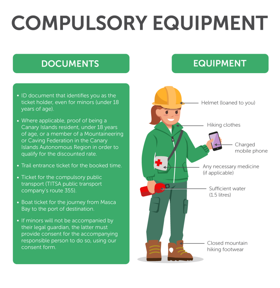 - Where applicable, proof of being a Canary Islands resident, under 18 years of age, or a member of a Mountaineering or Caving Federation in the Canary Islands in order to qualify for the discounted rate.